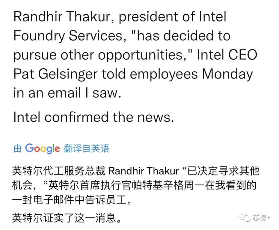 英特爾首席執(zhí)行官 Pat Gelsinger 向公司員工發(fā)送了一封電子郵件,感謝 Randhir Thakur 在建立英特爾芯片代工服務(wù)(IFS,Intel Foundry Services )方面的投入和對公司 IDM 2.0(集成設(shè)備制造 2.0)業(yè)務(wù)模式的幫助。